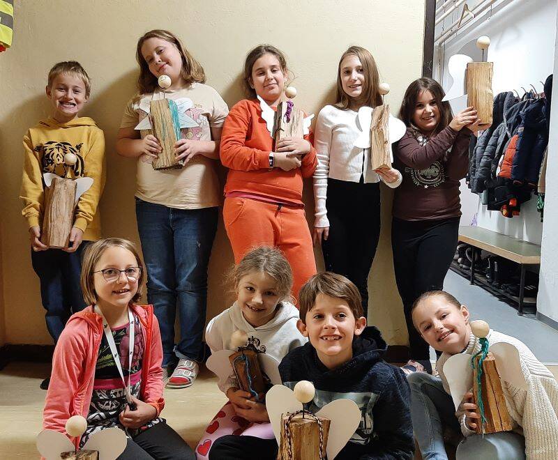 Im Gegenstand mit dem neuen Namen "Technik & Design" haben die Schülerinnen und Schüler der 3a Klasse unter anderem diese rustikalen Engel aus Holz gestaltet. Die Freude über das gute Gelingen ist in den Gesichtern der Kinder ablesbar.