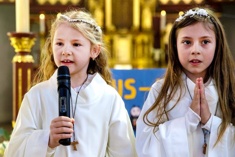 „Endlich dürfen wir Erstkommunion feiern!“ dachten sich wohl viele Erstkommunionkinder am 7. April, als sie sich gemeinsam mit ihren Familien, Geschwistern, Großeltern, Paten und Verwandten auf den Weg zur Kirche machten. Bei strahlendem Sonnenschein und sommerlichen Temperaturen versammelten sich alle Festgäste, darunter auch die Klassenlehrerinnen, in der Pfarrkirche St. Nikolai. Dann war es soweit: Die Erstkommunionkinder zogen feierlich mit Pater Terentius in die Kirche ein, begrüßten alle herzlich, sangen fröhliche Lieder und lasen ihre Texte vor.