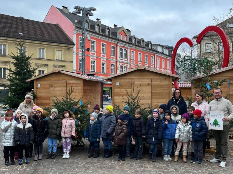 Die Kinder der 1b Klasse machten der Kreativwerkstatt alle Ehre. Sie bastelten mit großer Freude wunderschöne Anhänger für die Nordmanntannen beim Kunstadvent am Nikolaiplatz. Voller Stolz wurden die Christbäume für den Villacher Advent gemeinsam geschmückt und erste Zeitungsinterviews gegeben. Kleine Weihnachts-Künstler*innen ganz groß! Wir bedanken uns bei GF Pierre Bechler und Klaus Krall vom Villacher Stadtmarketing für die großartige Zusammenarbeit.